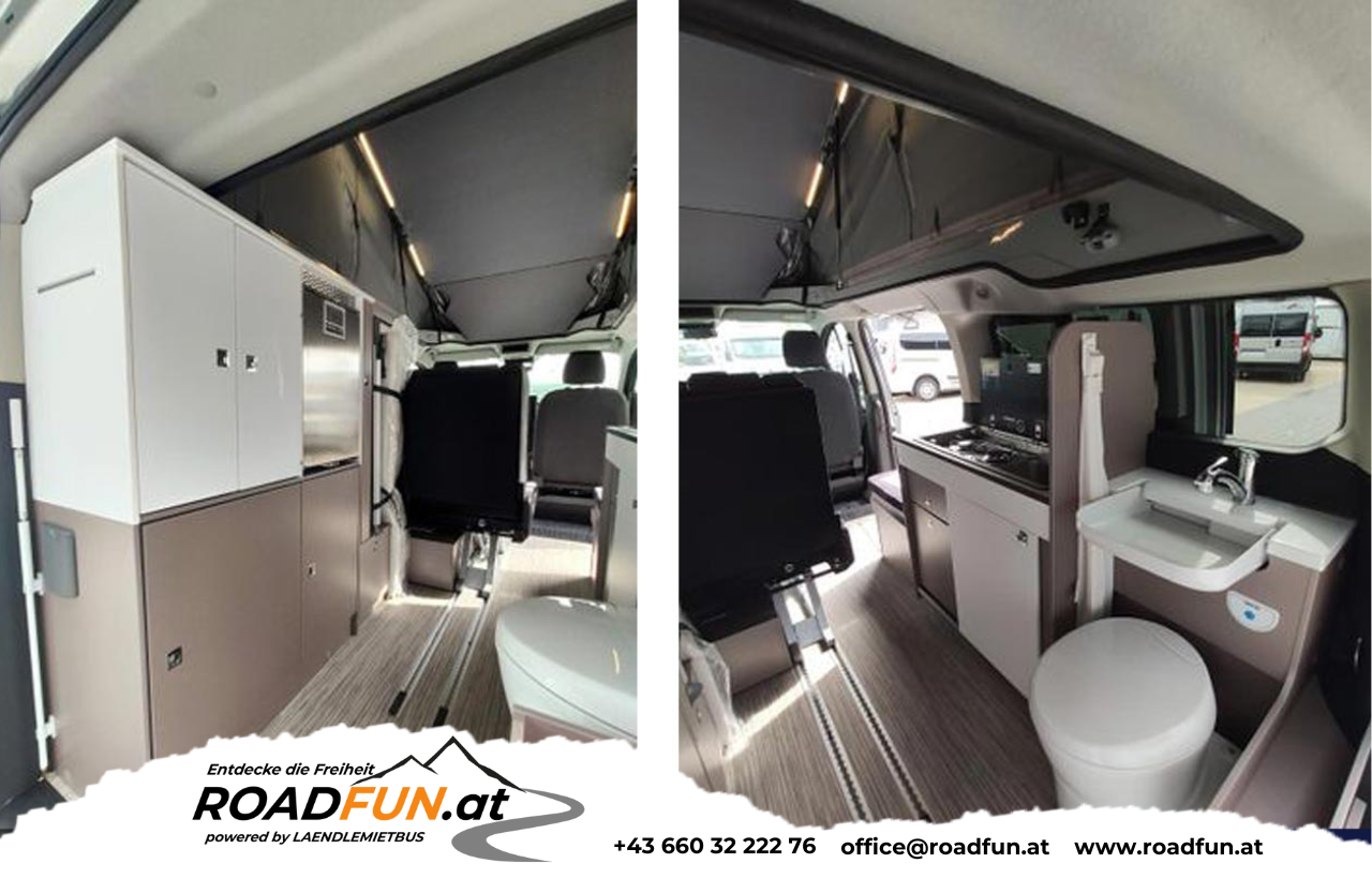 Komfort & Ausstattung: Markise Thule 5200 - 2,60 m anthrazit | Warmwasserboiler | Staufach unter der Bank | 1x 200 Watt tragbares Solarpanel | Lithium Batterie mit 100 Ah, Kapazität und Bluetooth Funktion zur Überwachung des Batteriestatus | 1 x MPPT Laderegler für maximale Ladeeffizienz