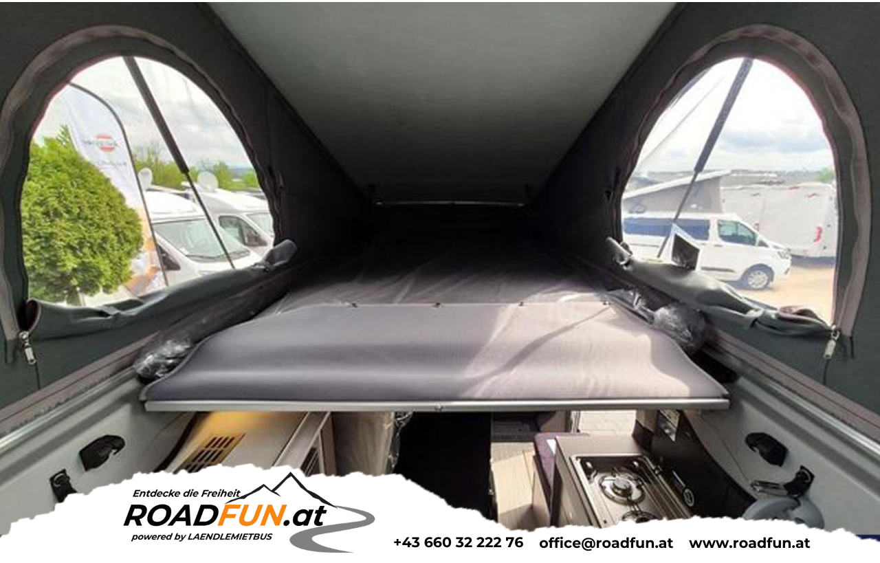 Aufstelldach Bett L: 2,0 x B 1,40  | verschiebbare Doppelsitzbank sowie Umbau zu Doppelbett mit Bettverbreiterung  | Vordersitze drehbar  | LED-Lichtleise / Ambiente Beleuchtung | 3x USB-Anschlüsse